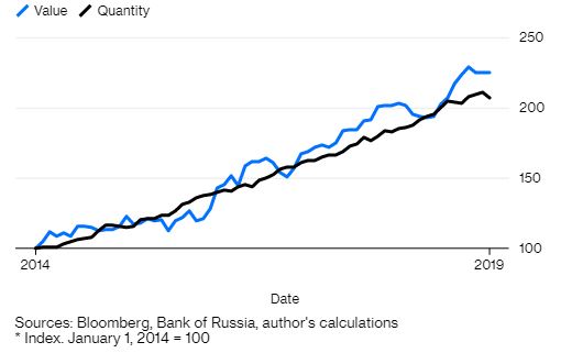 Αυτά τα στοιχεία, τα πιο πρόσφατα που είναι διαθέσιμα από την κεντρική τράπεζα, δείχνουν ότι το μερίδιο του χρυσού μειώνεται ελαφρά, αν και η Ρωσία πρόσθεσε 274 μετρικούς τόνους από το πολύτιμο μέταλλο στα αποθέματά της το 2018, οδηγώντας συνολικά τα αποθεματικά της στους 2.113 τόνους. Αυτό οφείλεται στο γεγονός ότι αυξήθηκαν και άλλα περιουσιακά στοιχεία καθώς η Ρωσία προσπάθησε να απομονώσει τις πιέσεις από τη Δύση - και στο ότι στους δώδεκα αυτούς μήνες, η τιμή του χρυσού μειώθηκε σχεδόν κατά 7%.