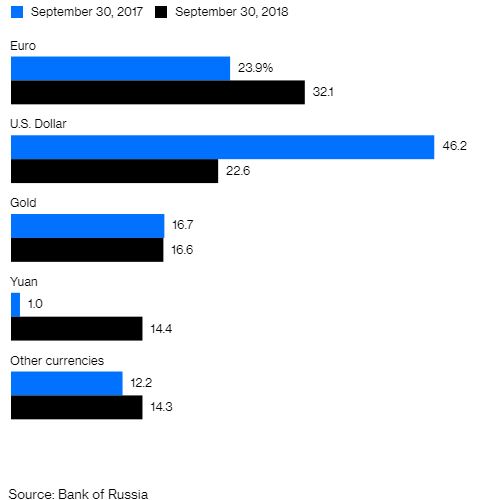 Από τότε που επλήγη από κυρώσεις για την επίθεσή της κατά της Ουκρανίας το 2014, η Ρωσία είχε λόγους να επανεξετάσει τη σύνθεση των διεθνών αποθεματικών της. Ενώ η Ευρωπαϊκή Ένωση δεν έχει εντείνει τις κυρώσεις της για σχεδόν πέντε χρόνια, οι ΗΠΑ το κάνουν συνεχώς. Το Κρεμλίνο και η Τράπεζα της Ρωσίας θεωρούν ότι ο κίνδυνος περαιτέρω περιορισμών είναι απρόβλεπτος και εξαρτάται περισσότερο από την εγχώρια πολιτική των ΗΠΑ παρά από ο,τιδήποτε κάνει η Ρωσία. Στο δωδεκάμηνο από το τέλος Σεπτεμβρίου του 2017, η κεντρική τράπεζα μείωσε κατά περισσότερο από το ήμισυ το μερίδιο των δολαρίων στα διεθνή στοιχεία ενεργητικού της και αύξησε δραστικά τα μερίδια του ευρώ και του γουάν.