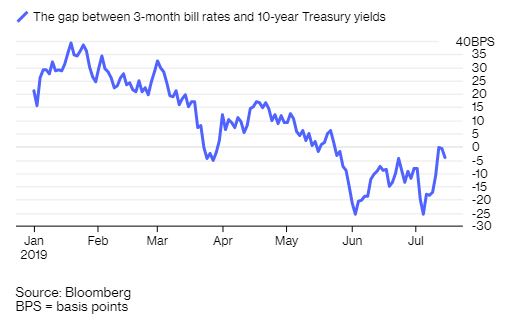 Αλλά με δεδομένο το πόσο πολύ έχει αναστραφεί η καμπύλη αποδόσεων τελευταία, η μείωση του επιτοκίου της Fed κατά 25 μονάδες βάσης αυτό το μήνα δεν αποτελεί εγγύηση ότι η καμπύλη αποδόσεων θα αντιστραφεί. Θα μπορούσε μάλιστα να παραμείνει ανεστραμμένη μέχρι τη συνεδρίαση νομισματικής πολιτικής της Fed του Σεπτεμβρίου. Αν γίνει έτσι, είναι δύσκολο να βρει κανείς μια περίοδο πέντε συνεχόμενων μηνών αναστροφής που δεν έχει προηγηθεί ύφεσης.