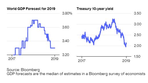 Στα επιχειρήματα υπέρ μιας μείωσης των επιτοκίων κατά 50 μονάδες βάσης, ας ξεκινήσουμε με τον οικονομικό παράγοντα που συσχετίζεται περισσότερο με τη μεταβολή των αποδόσεων των ομολόγων: τις προβλέψεις για την αύξηση του παγκόσμιου ακαθάριστου εγχώριου προϊόντος. Το γράφημα συγκρίνει τις αποδόσεις των 10ετών κρατικών ομολόγων των ΗΠΑ με τις εκτιμήσεις των οικονομολόγων για την αύξηση του παγκόσμιου ΑΕΠ το 2019 με βάση τα στοιχεία που συγκέντρωσε μέσω έρευνας το Bloomberg. Ακολουθούν στενά το ένα το άλλο.