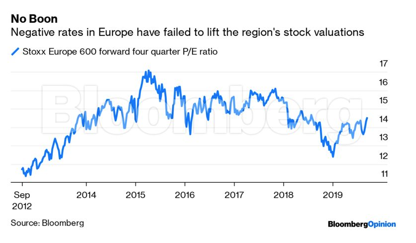 Σε έρευνά τους που δημοσιεύθηκε την περασμένη εβδομάδα, οι στρατηγικοί αναλυτές της Bank of America επεσήμαναν πως, παρόλο που οι αποδόσεις των 10ετών ομολόγων στη Γερμανία έχουν πέσει κάτω από το μηδεν, οι μετοχές διαπραγματεύονται με P/E μόλις στο 14. Αυτός ο λόγος δεν έχει αλλάξει παρά ελάχιστα από τα μέσα του 2014, όταν οι αποδόσεις ήταν περίπου στο 1,25% και η Ευρωπαϊκή Κεντρική Τράπεζα μείωσε το επιτόκιο αναφοράς κάτω από το μηδέν. Το ίδιο ισχύει και για την ευρύτερη ζώνη του ευρώ, όπου ο δείκτης Euro Stoxx 600 κινείται με forward P/Ε 14,5, όχι ιδιαίτερα διαφορετικό από εκείνο στα μέσα του 2014.