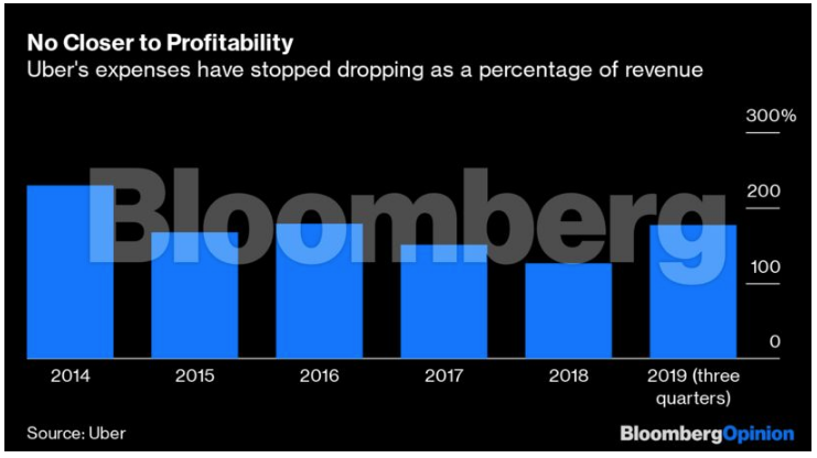 Ταυτόχρονα, οι δαπάνες της Uber έχουν σταματήσει να πέφτουν ως ποσοστό επί των εσόδων - κάτι που θα έπρεπε να συμβαίνει εάν η φρενήρης παγκόσμια επέκτασή της πρόκειται ποτέ να αποφέρει κέρδη που θα αντισταθμίζουν τα κεφάλαια που έχουν επενδυθεί. Ο Khosrowshahi έχει υποσχεθεί λειτουργική κερδοφορία μέχρι το 2021, ωστόσο η πορεία προς αυτό τον στόχο κάθε άλλο παρά εξασφαλισμένη μοιάζει.