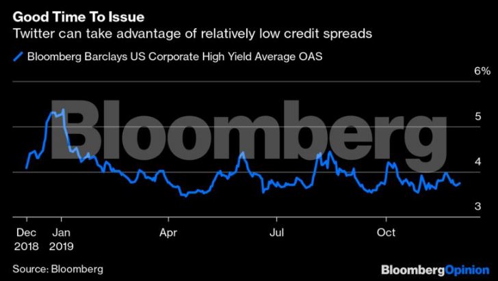 Το πλέον μακράς λήξης χρέος της, ένα μετατρέψιμο ομολογιακό δάνειο ύψους 1,15 δισ. δολ. με κουπόνι 0,25%, έχει πιστωτικό περιθώριο 300 μονάδων βάσης, ωστόσο η Twitter πιθανότατα θα έχει βελτιωμένη απόδοση στην - σαφώς μεγαλύτερης ρευστότητας - αγορά συμβατικών ομολόγων.