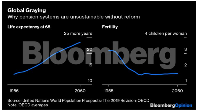 Αυτή η παγκόσμια κρίση των συνταξιοδοτικών συστημάτων είναι μια βραδυφλεγής βόμβα, η οποία δεν είναι βέβαια τόσο επικίνδυνη όσο η κλιματική αλλαγή, ωστόσο είναι σχεδόν εξίσου σημαντική για τις χρηματοπιστωτικές αγορές, το βιοτικό επίπεδο των ανθρώπων, καθώς και για πολλούς ακόμη τομείς. Το 2019, σχεδόν ένας στους 10 ανθρώπους ανά τον κόσμο θα συνταξιοδοτηθεί. Σύμφωνα με τα Ηνωμένα Έθνη, μέχρι το 2070, αυτή η αναλογία θα έχει μετατραπεί σε έναν στους πέντε.