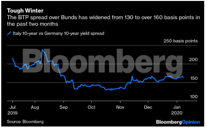 Είναι ένας ψυχρός και σκληρός χειμώνας για το ιταλικό κρατικό χρέος. Η χώρα έχει τη χειρότερη επίδοση της Ευρωζώνης στον συγκεκριμένο τομέα. Για πρώτη φορά, οι αποδόσεις των ιταλικών ομολόγων είναι μεγαλύτερες από εκείνες των ελληνικών ισοδυνάμων τους με λήξεις μεγαλύτερες των τριών ετών.