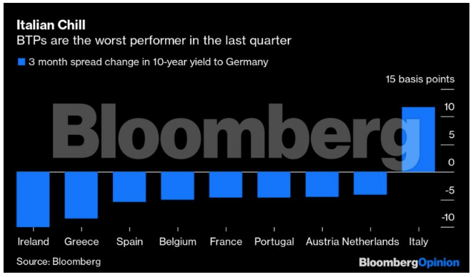 Η ιταλική είναι η μόνη ευρωπαϊκή αγορά ομολόγων της οποίας τα spread αποδόσεων έχουν διευρυνθεί σε σύγκριση με εκείνη της Γερμανίας - σημείο αναφοράς για όλη την Ευρωζώνη - τους τελευταίους τρεις μήνες. Αντίθετα, κατά τη διάρκεια του καλοκαιριού, η Ιταλία βρισκόταν στην πρωτοπορία της μείωσης αποδόσεων, στο άλλο άκρο του φάσματος. Τι πήγε λοιπόν στραβά;