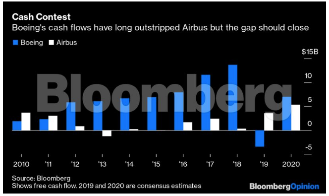 Το A400m συνεχίζει να επιβαρύνει τις ταμειακές ροές και η Airbus εξακολουθεί να αντιμετωπίζει δυσκολίες στην παραγωγή, αυτή τη φορά με το επιβατικό A321. Ακόμη κι έτσι, ωστόσο, με το 737 Max ακόμη στο έδαφος σε όλο τον κόσμο και την Boeing να αντιμετωπίζει ένα κύμα αρνητικών αντιδράσεων από ρυθμιστικές αρχές και πελάτες, το δυοπώλιο στον χώρο της κατασκευής αεροσκαφών που συγκρουτούν οι Airbus και Boeing αρχίζει να φαντάζει εξαιρετικά μη ισορροπημένο.