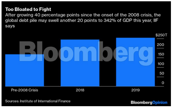 Δεν είναι λοιπόν περίεργο το γεγονός ότι η παγκόσμια οικονομία συνέχισε τη συσσώρευση χρέους. Η Κίνα ενίσχυσε τον δανεισμό για να διατηρήσει την υψηλή της ανάπτυξη σε έναν κόσμο που κινείτο σε χαμηλές αναπτυξιακές ταχύτητες. Η Ινδία λεηλάτησε τον χρηματοπιστωτικό της τομέα προκειμένου να επιτύχει ρυθμούς επέκτασης τύπου Κίνας.