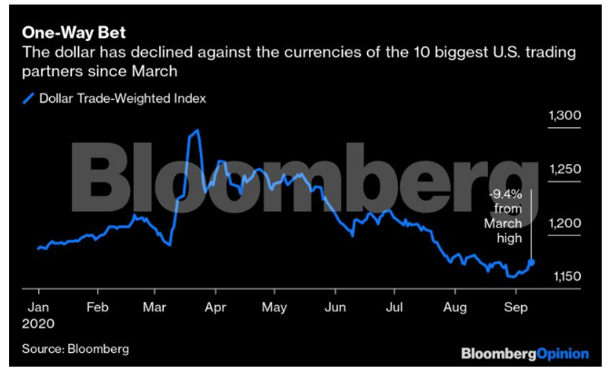Το νόμισμα των ΗΠΑ βρίσκεται σε καθοδικό σπιράλ κατά το μεγαλύτερο μέρος του τρέχοντος έτους, αφού επωφελήθηκε αρχικά από τις ροές που αναζητούσαν ασφαλές καταφύγιο τον Μάρτιο, καθώς οι παγκόσμιες επιπτώσεις της πανδημίας γίνονταν σιγά - σιγά εμφανείς.