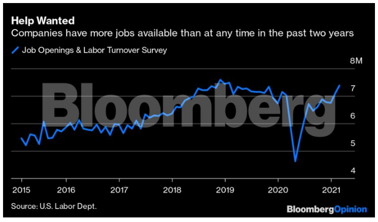 Είναι σαφές ότι η αγορά εργασίας αντιμετωπίζει πρόβλημα προσφοράς και όχι ζήτησης. Οι εργοδότες επιθυμούν να προσλάβουν, ωστόσο υπάρχουν λίγα άτομα διαθέσιμα. Το Bloomberg News ανέφερε ότι η Μοντάνα προσπαθεί να δελεάσει τους ανθρώπους να επιστρέψουν στις τάξεις του εργατικού δυναμικού με μια πληρωμή 1.200 δολ. εάν σταματήσουν να συλλέγουν επιδόματα ανεργίας και αποφασίσουν να εργαστούν για τουλάχιστον τέσσερις εβδομάδες. Η Νότια Καρολίνα σχεδιάζει να τερματίσει όλα τα ομοσπονδιακά και πολιτειακά προγράμματα ανακούφισης ανέργων που θεσμοθετήθηκαν την περίοδο της πανδημίας στα τέλη Ιουνίου.