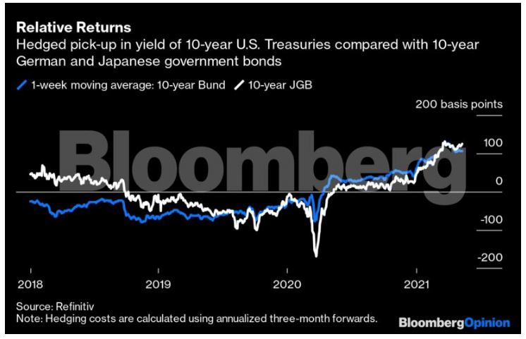 Ο τρίτος και ελαφρώς πιο περίπλοκος λόγος για τον οποίο οι διεθνείς επενδυτές αγοράζουν T-bonds είναι ότι η Fed πλημμύρισε τον πλανήτη με δολάρια και, ως εκ τούτου, προκάλεσε την κάθετη μείωση του κόστους των συναλλαγματικών swaps - ουσιαστικά, του κόστους δανεισμού δολαρίων στο εξωτερικό - αφού αυτό είχε αρχικά εκτιναχθεί στο πρώτο στάδιο της πανδημίας. Το παρακάτω διάγραμμα δείχνει τις 10ετείς αποδόσεις σε δολάρια σε σχέση με τις αντίστοιχες στη Γερμανία και την Ιαπωνία.