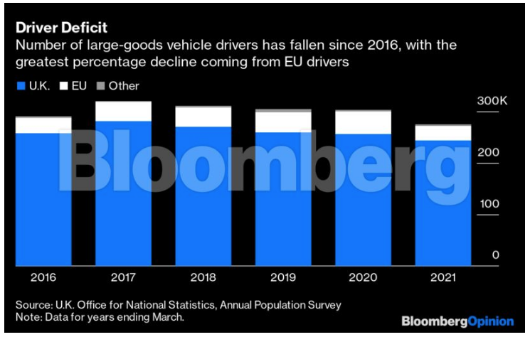 Ωστόσο, οι ελλείψεις εξειδικευμένου εργατικού δυναμικού στις μεταφορές αποτελούν πρόβλημα εδώ και αρκετό καιρό. Και παρόλο που ένας ένοχος ήταν πράγματι η μείωση των καθαρών επιπέδων μετανάστευσης από τις χώρες της ΕΕ (ενώ και πολλοί οδηγοί εγκατέλειψαν το Ηνωμένο Βασίλειο κατά τη διάρκεια της πανδημίας του Covid), υπάρχουν επίσης και άλλα μεγάλα ζητήματα.
