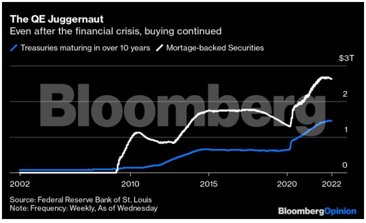 Κατά τη διάρκεια της χρηματοοικονομικής κρίσης του 2008, οι κεντρικές τράπεζες προσπαθούσαν απεγνωσμένα να εισφέρουν ρευστότητα στο χρηματοπιστωτικό σύστημα. Με το επιτόκιο πολιτικής στο μηδέν, χρειαζόταν να βρουν έναν άλλο μηχανισμό, γι' αυτό αγόραζαν μακροπρόθεσμα ομόλογα και εξασφαλισμένους τίτλους, εκτοξεύοντας το μέγεθος του ισολογισμού τους. Αυτό υποτίθεται ότι ήταν ένα μέτρο έκτακτης ανάγκης, ωστόσο συνεχίστηκε για χρόνια. Το QE ακολουθήθηκε από το QE2 και μετά από το QE3, καθώς η Fed φοβόταν ότι μια διακοπή του θα συνέτριβε τις αγορές ομολόγων.