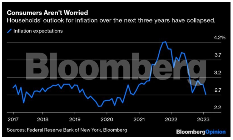 Μόλις αυτή την εβδομάδα, μηνιαία έρευνα η οποία δημοσιεύτηκε από την Federal Reserve Bank της Νέας Υόρκης έδειξε ότι οι προβλέψεις των καταναλωτών για τον πληθωρισμό έχουν υποχωρήσει στο χαμηλότερο επίπεδο από τον Οκτώβριο του 2020!