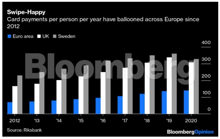 Η Σουηδία είναι μια ακραία περίπτωση: είναι μια μικρή οικονομία με υψηλή διείσδυση της σύγχρονης τεχνολογίας. Η πορεία των πραγμάτων, ωστόσο, είναι η ίδια παντού, επιταχυνόμενη από μια πανδημία η οποία είδε τους κωδικούς QR να αντικαθιστούν τα μενού των εστιατορίων και μια αύξηση των δαπανών μέσω Διαδικτύου - ακόμη και στη Σουηδία, όπου τα lockdown ήταν λιγότερο αυστηρά.