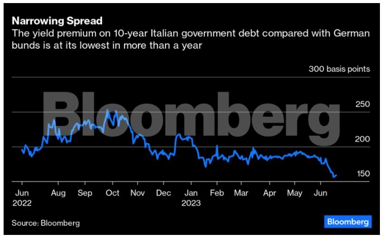 Τα τελευταία χρόνια έφεραν εκείνο που οι επενδυτές θεωρούν πολιτική σταθερότητα. Ακόμη και η ταραχώδης μετατόπιση του περασμένου έτους προς τα δεξιά από την κυβέρνηση εθνικής ενότητας του Μάριο Ντράγκι στην υπερσυντηρητική Τζόρτζια Μελόνι δεν έχει ακόμη ταράξει το οικονομικό σκάφος. Ενώ η κοινωνική ατζέντα της νέας πρωθυπουργού βαδίζει σε άνευ προηγουμένου έδαφος, η ίδια εμμένει στις δημοσιονομικές δεσμεύσεις του προκατόχου της. Το spread μεταξύ της απόδοσης των ιταλικών ομολόγων και των γερμανικών αντιστοίχων τους, το οποίο κάποτε ήταν καθημερινός δείκτης της ιταλικής οικονομικής πίεσης, έχει πέσει στο χαμηλότερο επίπεδο του τελευταίου έτους. Ο λόγος χρέους προς ΑΕΠ της Ιταλίας έχει επίσης μειωθεί, αλλά παραμένει υψηλός, γύρω στο 144%.