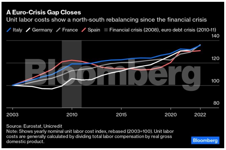 "Δεν έχουμε το μέγεθος της Γερμανίας ή του κράτους της Γαλλίας", λέει ο Marco Arduini, διευθύνων σύμβουλος της Eurogroup. "Ωστόσο έχουμε επιχειρηματικό πνεύμα". Όπως δείχνει το παρακάτω διάγραμμα, στην ευρωζώνη μειώθηκε το χάσμα της κρίσης μεταξύ ενός παραγωγικού Βορρά και ενός μη ανταγωνιστικού Νότου: σήμερα η Γερμανία είναι το μέρος όπου η αύξηση των μισθών ξεπερνά την αύξηση της παραγωγικότητας, ενώ οι χώρες του νότου έχουν αυξημένη παραγωγικότητα, σύμφωνα με την Unicredit.