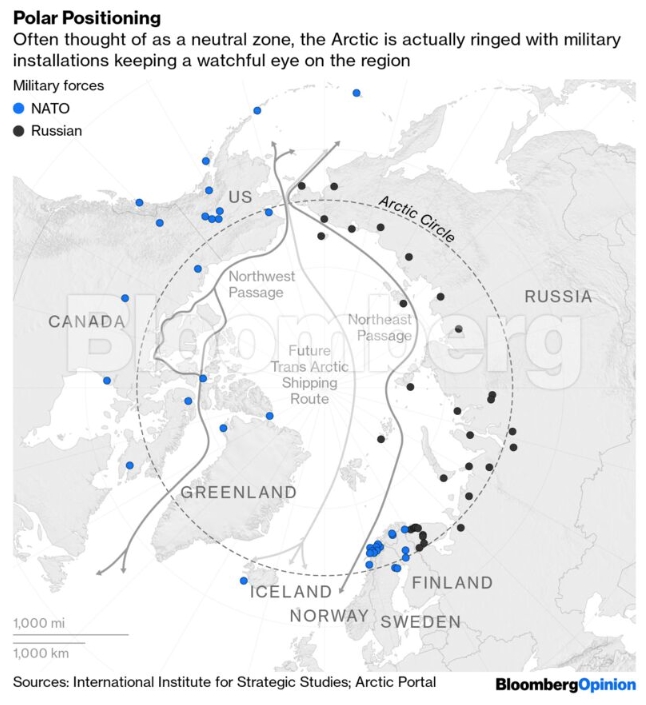 Κάντε ένα βήμα πίσω και δείτε τη γεωγραφία. Η κορυφή του κόσμου είναι ένα γεωπολιτικό Thunderdome, με το έπαθλο του Αρκτικού Ωκεανού στο κέντρο του. Καθώς η υπερθέρμανση του πλανήτη αφαιρεί όλο και περισσότερο το κάλυμμα του πάγου, η πρόσβαση σε ζωτικής σημασίας ναυτιλιακές διαδρομές και υδρογονάνθρακες -πετρέλαιο και φυσικό αέριο- θα είναι όλο και πιο κρίσιμη για τα έθνη στην μπροστινή βεράντα της Αρκτικής Θάλασσας (ο συνάδελφός μου στο Bloomberg Opinion, Liam Denning, ο οποίος πρόσφατα επέστρεψε από την περιοχή, ετοιμάζει μια εξαιρετική σειρά άρθρων και βίντεο για όλα αυτά).