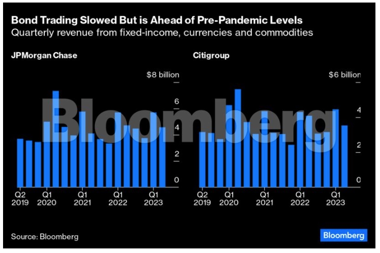 Οι δραστηριότητες επενδυτικής τραπεζικής και trading συνεχίζουν να δυσκολεύονται. Ο Barnum τόνισε ότι το κλείσιμο deals αντιμετώπισε το τελευταίο διάστημα αντίρροπους ανέμους και, ενώ η συγκέντρωση χρημάτων μετοχικού κεφαλαίου αυξήθηκε λίγο τον Ιούνιο, ήταν πολύ νωρίς για να μιλήσουμε για νέα "βλαστάρια". Στην JPMorgan και στη Citigroup, οι προμήθειες επενδυτικής τραπεζικής και τα έσοδα από τη διαπραγμάτευση μετοχών μειώθηκαν σε σχέση με το προηγούμενο έτος, κάτι που συνεχίζεται εδώ και αρκετά τρίμηνα.