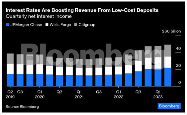 Καθώς η JPMorgan ανακοίνωσε το πιο κερδοφόρο τρίμηνο στην ιστορία της, και οι τρεις τους αύξησαν τις προβλέψεις για τα ετήσια καθαρά έσοδα από τόκους, ενθαρρυμένες από τον μικρότερο του αναμενομένου ανταγωνισμό για καταθέσεις, παράλληλα με τα υψηλότερα επιτόκια δανειακών χορηγήσεων.