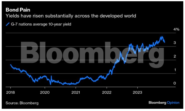 Οι πωλήσεις κρατικών ομολόγων αναμένεται να αυξηθούν περαιτέρω το επόμενο έτος, καθώς τα δημοσιονομικά ελλείμματα διογκώνονται σε ολόκληρο τον ανεπτυγμένο κόσμο. Δυστυχώς, αυτό συμπίπτει με την επιτάχυνση, από πλευράς των κεντρικών τραπεζών, της μείωσης των διαθεσίμων ομολόγων τα οποία συσσωρεύτηκαν στους ισολογισμούς τους μέσω της ποσοτικής χαλάρωσης (QE). Αυτό το διπλό χτύπημα σημαίνει ότι οι αποδόσεις των ομολόγων, ιδιαίτερα στο άκρο της καμπύλης με τους μεγαλύτερους χρόνους λήξης, πρέπει να ετοιμάζονται για ένα δύσκολο 2024.