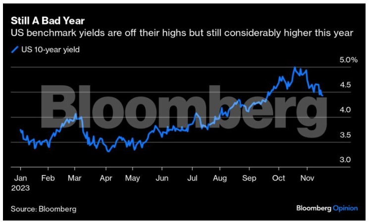 Ο κύριος μοχλός της πτώσης κατά 50 μονάδες βάσης στις αποδόσεις του 10ετούς των ΗΠΑ μέχρι στιγμής αυτόν τον μήνα ήταν η χαμηλότερη από την αναμενόμενη ανακοίνωση αναχρηματοδότησης του χρέους για το δ’ τρίμηνο στις 30 Οκτωβρίου. Καταδεικνύει πόσο ευαίσθητη έχει φτάσει να είναι η αγορά ομολόγων των ΗΠΑ και κατ' επέκταση εκείνη ανά τον υπόλοιπο κόσμο, στις διαρκώς διευρυνόμενες δημοπρασίες αμερικανικών ομολόγων. Ωστόσο, οι αποδόσεις στο 4,5% παραμένουν μια πλήρη ποσοστιαία μονάδα υψηλότερες απ' ό,τι ήταν τον Απρίλιο, αν και ήταν χαμηλότερες από το ανώτατο 5% στα μέσα Οκτωβρίου. Πολλοί παράγοντες επηρεάζουν τις αξίες των ομολόγων, η μόνη σταθερά σε έναν συνεχώς μεταβαλλόμενο κόσμο ωστόσο είναι η αύξηση της έκδοσης χρέους.