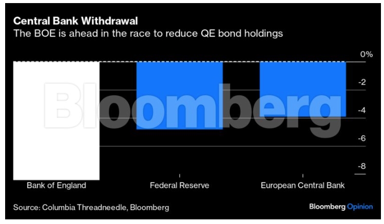 Η BoE παίζει σε μια δική της κατηγορία, με ταυτόχρονη ποσοτική σύσφιξη και μείωση του ισολογισμού της με διπλό ρυθμό σε σχέση με τη Fed και την ΕΚΤ. Προχωρά ακόμη μακρύτερα, προχωρώντας σε ενεργές πωλήσεις πίσω στην αγορά. Θα μειώσει τα εναπομείναντα βρετανικά κρατικά ομόλογα αξίας 750 δισεκατομμύρια στερλινών (930 δισεκατομμύρια δολάρια) τα οποία διατηρεί στο χαρτοφυλάκιό της κατά επιπλέον 110 δισεκατομμύρια στερλίνες φέτος.