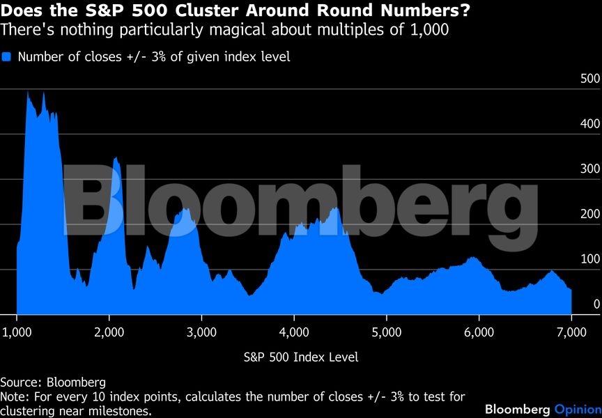 Όσον αφορά στα "ορόσημα" του S&P 500 (5.000, 6.000, 7.000 μονάδες κ.λπ.), δεν υπάρχει τίποτα το ιδιαίτερο σε αυτούς τους αριθμούς. Το μοναδικό επιχείρημα για να ασχοληθεί κανείς μαζί τους είναι ότι οι άλλοι φαίνεται να τους δίνουν σημασία. Ωστόσο, υπάρχουν ελάχιστα στοιχεία ιστορικά που να υποδηλώνουν ότι η δυναμική της αγοράς αλλάζει πραγματικά γύρω από αυτά τα επίπεδα. Στα στοιχεία από τον Ιανουάριο του 2000, δεν διακρίνω σαφή και επίμονα σημάδια συγκέντρωσης γύρω από στρογγυλούς αριθμούς.
