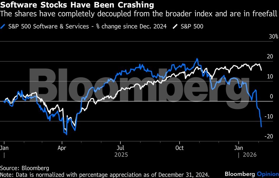 Παράλληλα, οι επενδυτές αρχίζουν να ανησυχούν για τις μετοχές των εταιρειών λογισμικού. Την τελευταία δεκαετία, οι εταιρείες λογισμικού για επιχειρήσεις (Enterprise Software) που λειτουργούν με συνδρομές θεωρούνταν οι "κότες με τα χρυσά αυγά" και, αρχικά, οι πιθανοί ωφελημένοι της επανάστασης της τεχνητής νοημοσύνης. Αυτό είχε ως αποτέλεσμα οι αποτιμήσεις τους να φτάσουν σε υπερβολικά υψηλά επίπεδα στα τέλη του 2025. Ωστόσο, οι πρόσφατες εξελίξεις έχουν οδηγήσει τους επενδυτές να εξετάζουν το ενδεχόμενο η τεχνητή νοημοσύνη να μπορεί τελικά να αντικαταστήσει ορισμένα προϊόντα λογισμικού - μια ιδέα που απέκτησε δυναμική αφότου η Anthropic PBC λάνσαρε ένα νέο εργαλείο αυτοματισμού μέσω AI.