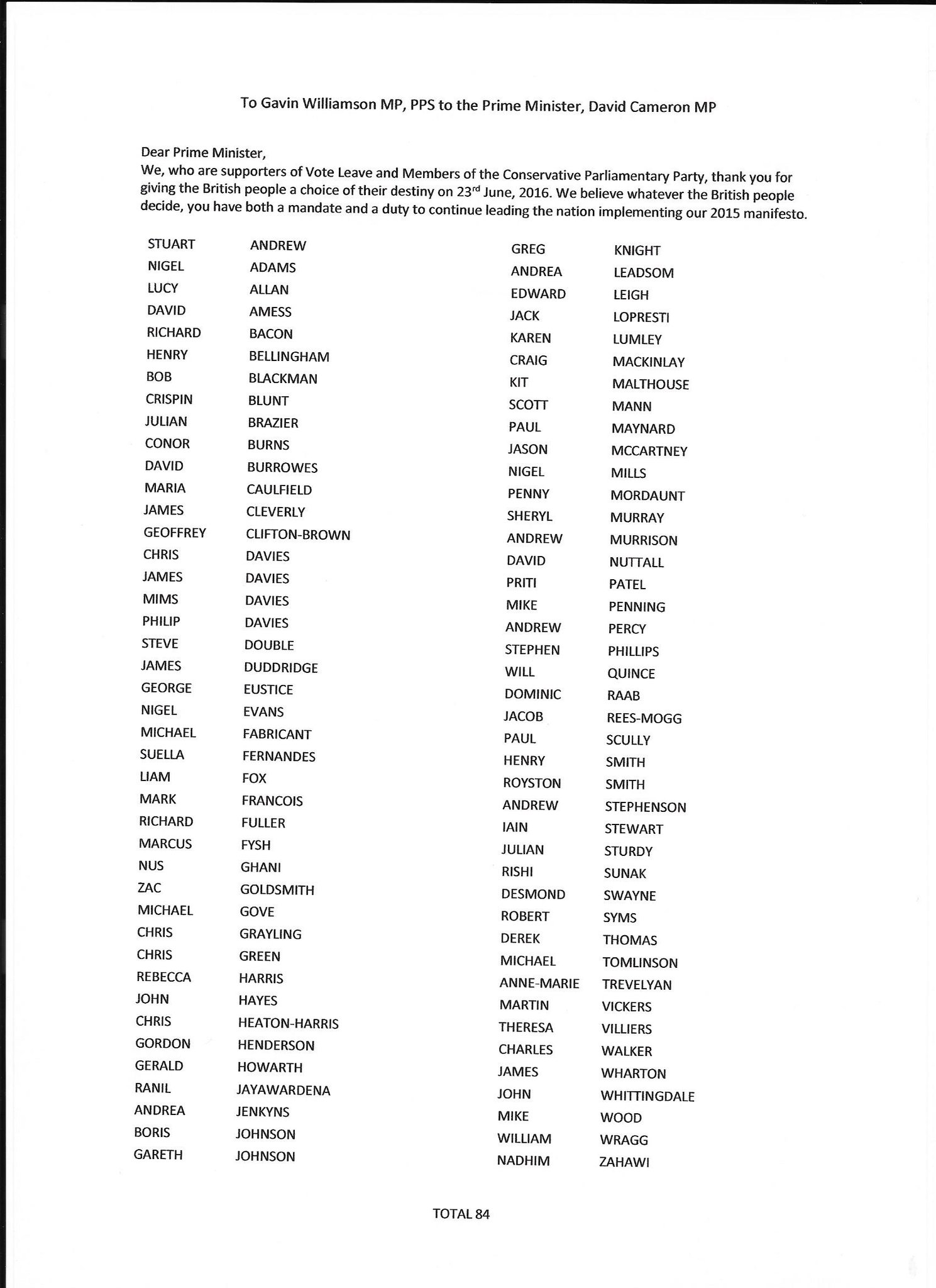 Εμείς που υποστηρίζουμε την έξοδο από την Ευρωπαϊκή Ένωση και είμαστε μέλη του Συντηρητικού Κόμματος, ευχαριστούμε που δώσατε στον βρετανικό λαό την δυνατότητα να επιλέξουν την μοίρα τους την 23η Ιουνίου. Πιστεύουμε πως όποιο και αν είναι το αποτέλεσμα, έχετε τόσο την εντολή όσο και το καθήκον να συνεχίσετε να ηγείστε της χώρας.