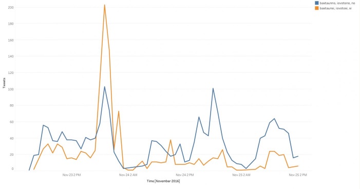 Μια αρχική σύγκριση των δύο ομάδων hashtags: #bastaunsi #iovotosi #si έναντι των #iovotono #no και βασισμένη σε σύνολο 26.431 tweets τις τελευταίες ημέρες, δείχνει την υπεροχή του "όχι” στα social media, στην εβδομάδα πριν από το δημοψήφισμα.