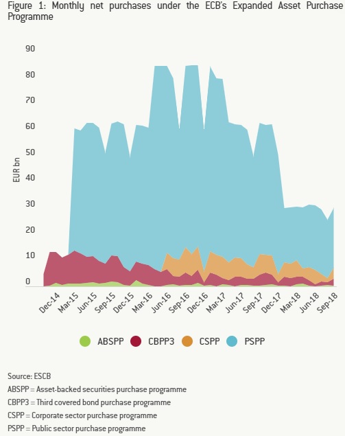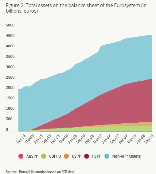 Μέχρι τα τέλη Δεκεμβρίου 2018, η Ευρωπαϊκή Κεντρική Τράπεζα (ΕΚΤ) και οι εθνικές κεντρικές τράπεζες (NCBs), κατείχαν συνολικά 2,532 τρισ. ευρώ στο πλαίσιο του διευρυμένου προγράμματος αγοράς asset (APP). Τα 2,076 τρισ. δολάρια από αυτά τα assets ήταν ομόλογα που αποκτήθηκαν στο πλαίσιο του προγράμματος της ΕΚΤ αγοράς assets του δημοσίου τομέα PSPP). Οι συμμετοχές με βάση το πρόγραμμα αγοράς τίτλων υποστηριζόμενων από assets (ABSPP) διαμορφώθηκαν στα 27 δισ. ευρώ μέχρι το τέλος Σεπτεμβρίου, ενώ τα assets που αγοράστηκαν στο πλαίσιο του τρίτου προγράμματος αγοράς καλυμμένων ομολόγων (CBPP3) ανήλθαν σε 259 δισ. ευρώ. Ξεκινώντας τον Ιούνιο του 2016, η ΕΚΤ πρόσθεσε επίσης ένα πρόγραμμα αγοράς εταιρικών τίτλων (CSPP), το οποίο τώρα διαμορφώνεται στα 170 δισ. ευρώ.