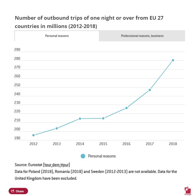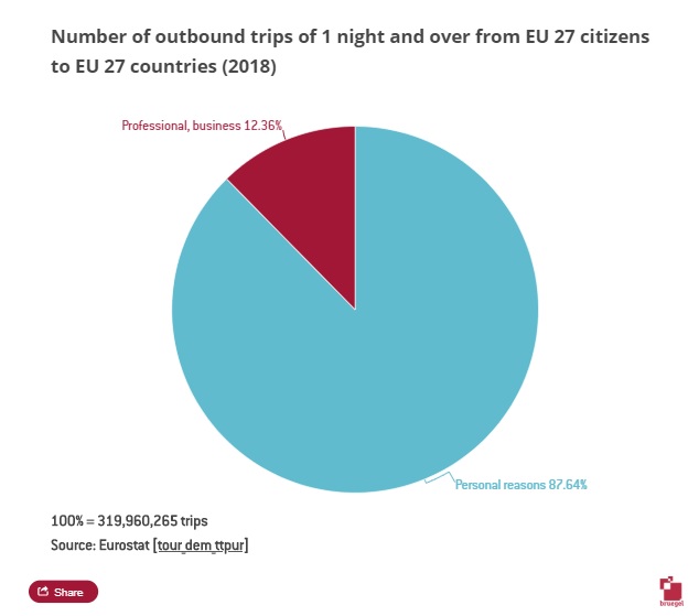 Η συνάφεια της συμφωνίας της Σένγκεν εκτείνεται πέρα από τη διασυνοριακή μετάβαση στην εργασία. Το 2018, πολίτες των 27 χωρών της ΕΕ έκαναν περίπου 320 εκατ. Ταξίδια μιας διανυκτέρευσης και περισσότερο, σε άλλες χώρες της ΕΕ, ενώ περισσότεροι από 39 εκατ. (12%) εξ αυτών προορίζονταν για επαγγελματικούς σκοπούς.