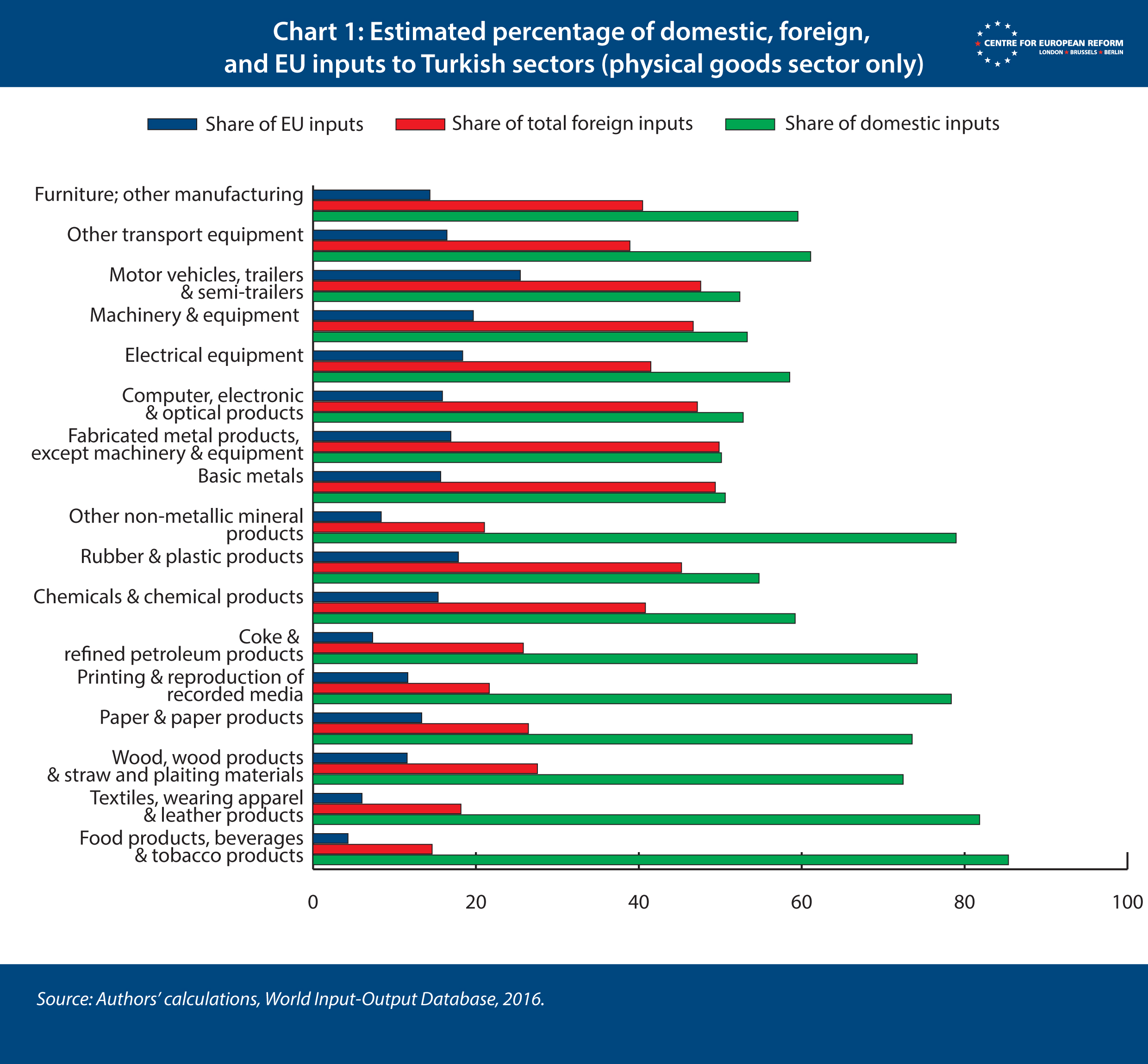Ωστόσο, ακόμη και αν η ΕΕ και το Ηνωμένο Βασίλειο, και κατ' επέκτασιν η Τουρκία και το Ηνωμένο Βασίλειο, συνάψουν συμφωνία ελεύθερου εμπορίου που θα καταργεί δασμούς και ποσοστώσεις στα βιομηχανικά αγαθά, αυτό θα συνιστά και πάλι μια απότομη επιδείνωση των εμπορικών όρων σε σχέση με τους υφιστάμενους, και θα προκαλέσει προβλήματα σε εταιρείες που πραγματοποιούν συναλλαγές μεταξύ Ηνωμένου Βασιλείου και Τουρκίας. Σε αντίθεση με τις συναλλαγές εντός της τελωνειακής ένωσης, για να μπορεί ένα εξαγόμενο αγαθό να πληροί τις προϋποθέσεις για δασμολογική απαλλαγή στη βάση μιας συμφωνίας ελεύθερων συναλλαγών, πρέπει να πληροί συγκεκριμένους κανόνες καταγωγής. Αυτό γίνεται για να διασφαλιστεί ότι οι εξαγωγές δεν προέρχονται από κάπου αλλού. Για να δώσω ένα συγκεκριμένο παράδειγμα, οι εμπορικές συμφωνίες της ΕΕ, και συνεπώς οι τουρκικές εμπορικές συμφωνίες, απαιτούν συχνά τουλάχιστον το 60% της αξίας ενός εξαγόμενου αυτοκινήτου να έχει παραχθεί τοπικά για να πληροί τις προϋποθέσεις για μηδενικούς δασμούς. Εάν ένα παρόμοιο κατώτατο όριο επρόκειτο να εφαρμοστεί σε μια εμπορική συμφωνία με το Ηνωμένο Βασίλειο, θα δημιουργούσε πρόβλημα σε ορισμένους Τούρκους εξαγωγείς αυτοκινήτων, καθώς αντλούν μόνο περίπου το 50% των εισροών τους από την Τουρκία (Διάγραμμα 1).