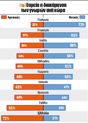 Σε αυτήν αποκαλύπτεται ότι η χώρα με το υψηλότερο ποσοστό αρνητικών γνωμών για την Ε.Ε. (71%) δεν είναι παρά η Ελλάδα – και αν αυτό μπορεί να χαρακτηρισθεί αναμενόμενο μετά από έξι χρόνια οικονομικής κρίσης και ευρωπαϊκής επιτροπείας, οπωσδήποτε εντυπωσιάζει το ότι δεύτερη στην κατάταξη ακολουθεί η Γαλλία, ιδρυτικό μέλος της ΕΟΚ το 1957, με ποσοστό αρνητικών γνωμών 61%. Ακολουθεί η Ισπανία με ποσοστό 49% (έναντι 47% θετικής γνώμης), ενώ η πολυσυζητημένη Βρετανία ισοψηφεί με τη Γερμανία στο 48% (έναντι 44% και 50% θετικών γνωμών αντιστοίχως). Οι χώρες με το χαμηλότερο ποσοστό αρνητικών γνωμών για την Ε.Ε. είναι και οι μόνες δύο ανατολικοευρωπαϊκές του δείγματος, ήτοι η Πολωνία (22%) και η Ουγγαρία (37%), οι οποίες, παρεμπιπτόντως, αποτελούν στην παρούσα φάση "μαύρα πρόβατα" για τους ευρωπαϊκούς θεσμούς, καθώς οι κυβερνήσεις τους θεωρείται ότι εκδηλώνουν αντιδημοκρατική υπερσυγκεντρωτική ροπή.