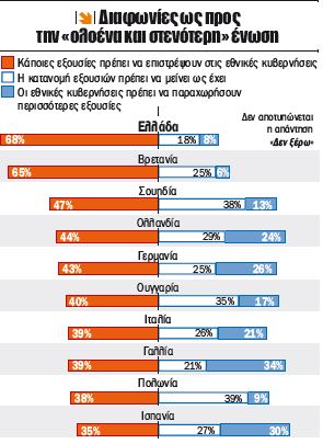 Σε κάθε περίπτωση, αυτό που δεν δείχνει να εμπνέει καθόλου τους πολίτες είναι η προοπτική της "ολοένα και στενότερης ένωσης", καθώς κατά μέσο όρο το 42% του συνόλου των ερωτηθέντων (ποσοστό που αναλυόμενο ξεκινά από το 35% των Ισπανών, το 39% των Γάλλων, το 43% των Γερμανών και φθάνει στο 66% των Βρετανών και το 68% των Ελλήνων) επιθυμεί επαναπατρισμό εξουσιών στις πρωτεύουσές τους, ενώ μόνο σε 4 από τις 10 χώρες υπερισχύει το άθροισμα όσων επιθυμούν περαιτέρω εμβάθυνση της ενοποίησης ή διατήρηση του status quo και το υψηλότερο ποσοστό υπέρ της μεταφοράς περισσότερων αρμοδιοτήτων στις Βρυξέλλες καταγράφεται στη Γαλλία (34%).