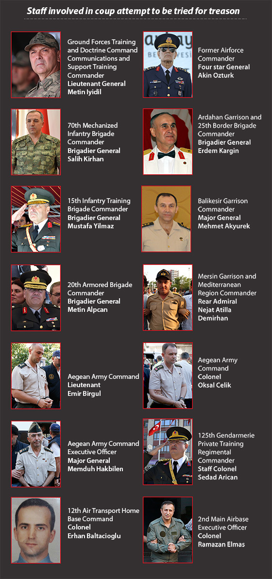 Νωρίτερα η Daily Sabah κατονόμασε ορισμένα ανώτατα στελέχη των τουρκικών ενόπλων δυνάμεων, τα οποία φέρονται να έχουν άμεση συμμετοχή στο αποτυχημένο πραξικόπημα και θα οδηγηθούν ενώπιον της δικαιοσύνης για εσχάτη προδοσία.