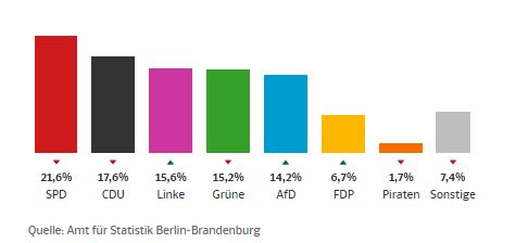 Πρώτο κόμμα αναδεικνύεται το SPD (21,6%), σύμφωνα με τα (προσωρινά) τελικά αποτελέσματα των χθεσινών τοπικών εκλογών για τη Γερουσία του Βερολίνου.
