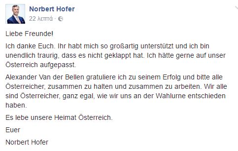 Με ανάρτηση στον προσωπικό του λογαριασμό στο Facebook, ο Norbert Hofer, που διεκδίκησε την αυστριακή προεδρία, παραδέχτηκε την ήττα του και την επικράτηση του Van der Bellen.