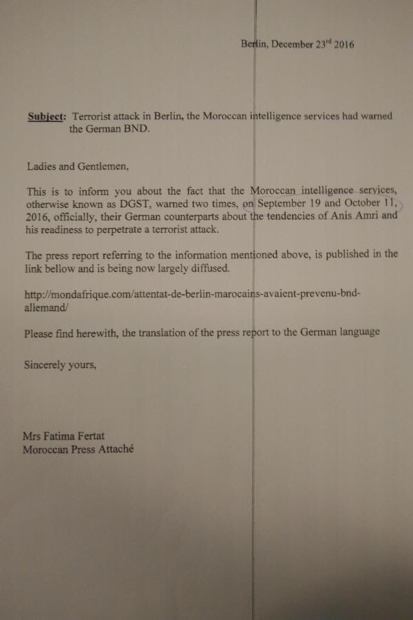 Σύμφωνα με τον ΣΚΑΪ, στην επιστολή της η ηγεσία της αντιτρομοκρατικής υπηρεσίας του Μαρόκου αναφέρει πως τόσο στις 19 Σεπτεμβρίου όσο και στις 11 Οκτωβρίου είχε αποσταλεί προς τις γερμανικές αρχές γραπτή προειδοποίηση για τις δράσεις του Τυνήσιου Ανίς Αμρί με την ένδειξη εμπιστευτικό.