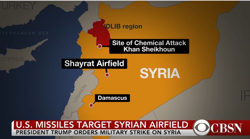 Σήμερα το βράδυ, διέταξα ένα στοχευμένο στρατιωτικό πλήγμα κατά της αεροπορικής βάσης στη Συρία από την οποία εξαπολύθηκε η επίθεση με τα χημικά όπλα. Είναι προς το ουσιαστικό εθνικό συμφέρον των ΗΠΑ να δράσουν προληπτικά και να αποτρέψουν την εξάπλωση της χρήσης των θανατηφόρων χημικών όπλων. Δεν υπάρχει καμία αμφιβολία ότι η Συρία χρησιμοποίησε απαγορευμένα χημικά όπλα, παραβίασε τις υποχρεώσεις της έναντι της Συμφωνίας για τα Χημικά Όπλα, ενώ αγνόησε επιδεικτικά το Συμβούλιο Ασφαλείας του ΟΗΕ.