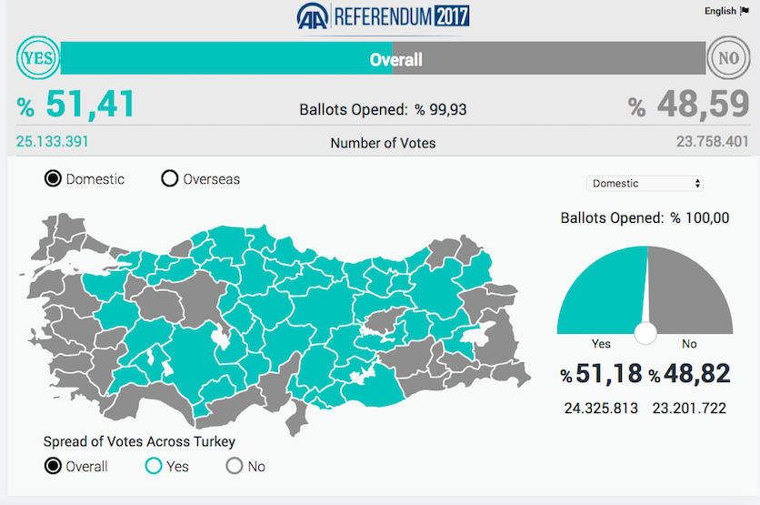Με μικρή διαφορά έκλεισε η νίκη του "ναι" έναντι του "όχι" στο δημοψήφισμα για τη συνταγματική αναθεώρηση στην Τουρκία. Συγκεκριμένα, και σύμφωνα με τα προκαταρκτικά στοιχεία που μεταδίδει το επίσημο πρακτορείο Anadolu (τα τελικά θα ανακοινωθούν σε 11-12 ημέρες), με καταμετρημένο το 99,93% των συνολικών ψήφων, το "Ναι" προηγείται με ποσοστό 51,41% έναντι του "Όχι" που λαμβάνει 48,59%.