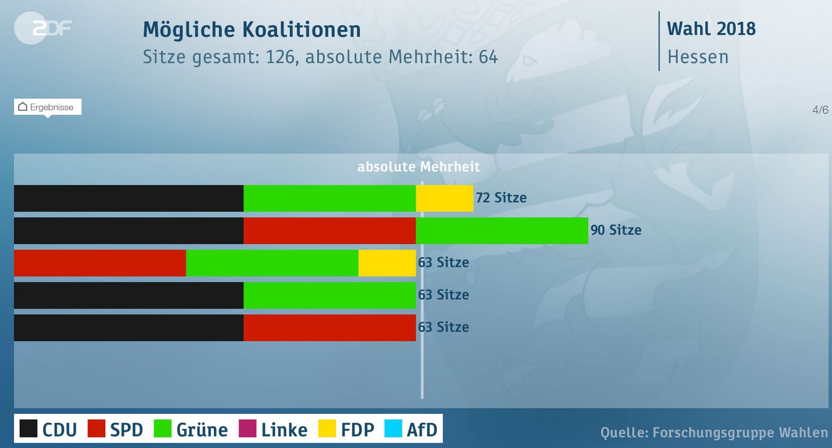 Όσον αφορά τα μετεκλογικά σενάρια σχηματισμού κυβέρνησης στην Έσση, βάσει των ποσοστών και των αντίστοιχων εδρών που αναμένεται να καταλάβουν τα κόμματα τα οποία συμμετείχαν στις εν λόγω εκλογές, έχουν ως εξής: