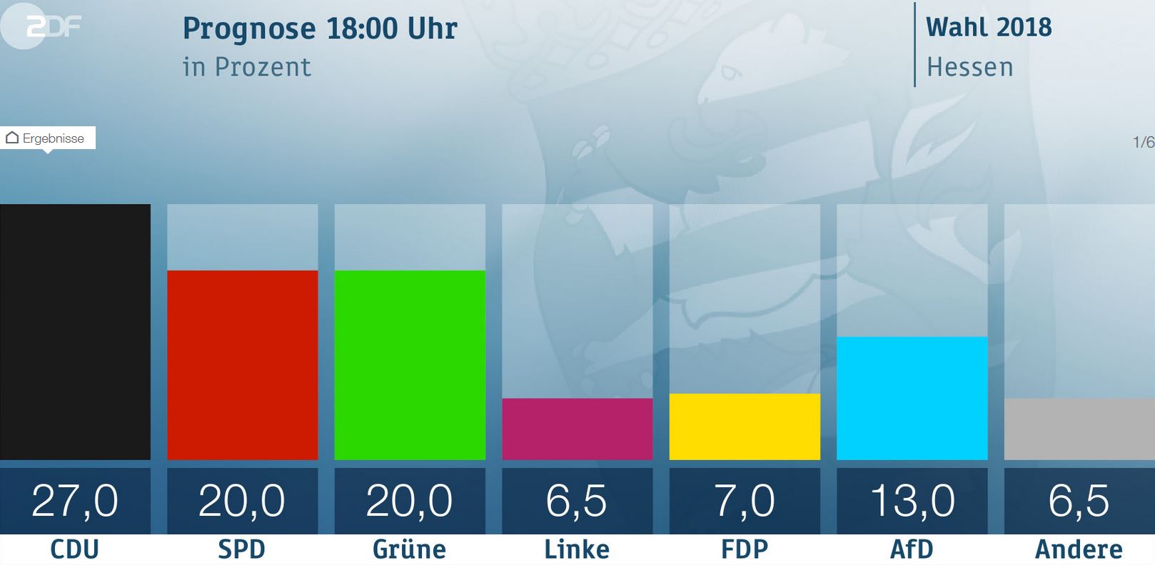 Σύμφωνα με τα exit polls στην Έσση, το CDU, δηλαδή το κόμμα της Γερμανίδας Καγκελαρίου, Άνγκελα Μέρκελ, χάνει 11 μονάδες (σε σχέση με τις τοπικές εκλογές του 2013), αλλά διατηρεί την πρώτη θέση με 27%. Το SPD λαμβάνει 20%, χάνοντας 10 μονάδες.