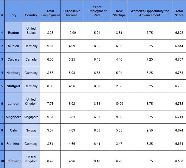 Η καλύτερη πόλη για να βρει κανείς δουλειά είναι η Βοστόνη, και στις δέκα πρώτες με σειρά κατάταξης βρίσκονται οι Μόναχο, Κάλγκαρι, Αμβούργο, Στουτγάρδη, Λονδίνο, Σιγκαπούρη, Όσλο, Φρανκφούρτη, Εδιμβούργο.