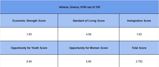 Η γερμανική εταιρεία Movinga στην μελέτη της επισημαίνει ότι η Αθήνα βρίσκεται στην τελευταία θέση μεταξύ 100 πόλεων, συγκεντρώνοντας γενική βαθμολογία 3,9 μονάδες στο σύνολο των 10 μονάδων.