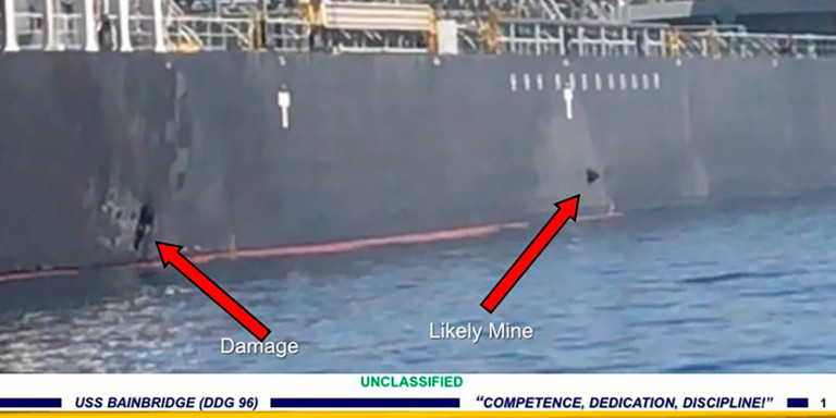 Οι ένοπλες δυνάμεις των ΗΠΑ έδωσαν στη δημοσιότητα ένα βίντεο που λένε ότι εικονίζει στελέχη των Φρουρών της Επανάστασης, επίλεκτου σώματος των ένοπλων δυνάμεων του Ιράν, καθώς προσεγγίζουν το ένα από τα δύο δεξαμενόπλοια που δέχθηκαν επίθεση χθες στον Κόλπο του Ομάν και κατόπιν αφαιρούν μια μαγνητική νάρκη που δεν είχε εκραγεί από το πλευρό του κύτους του τάνκερ, καθώς και μια φωτογραφία που εικονίζει τη νάρκη πάνω στο πλοίο πριν απομακρυνθεί.