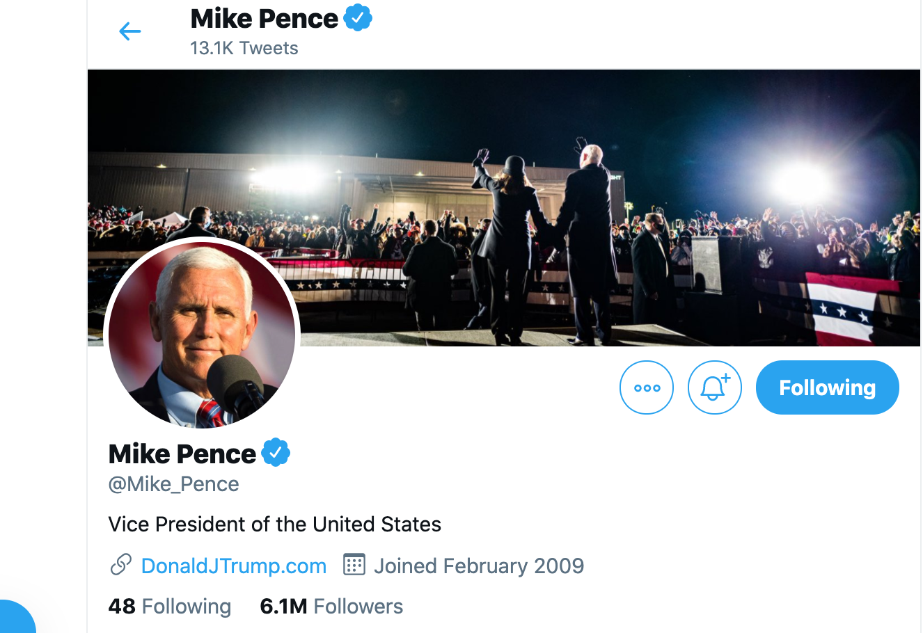 Ο κ. Πενς έβγαλε από τoν προσωπικό του λογαριασμό στο Twitter τη φωτογραφία του Ντόναλντ Τραμπ και την αντικατέστησε με μια φωτογραφία του εκλεγμένου προέδρου Τζο Μπάιντεν και της αντιπροέδρου Καμάλα Χάρις.