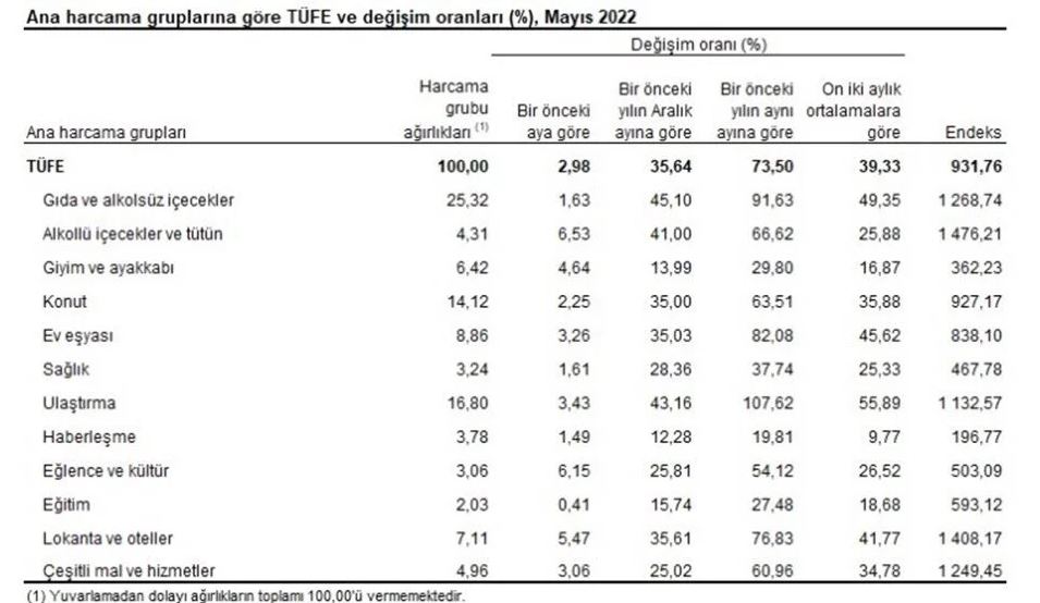 Σύμφωνα με τα στοιχεία της TUIK τον Μάιο, ο ΔΤΚ αυξήθηκε κατά 2,98 τοις εκατό σε σύγκριση με τον προηγούμενο μήνα, κατά 35,64% σε σύγκριση με τον Δεκέμβριο του προηγούμενου έτους, κατά 73,50% σε σύγκριση με τον αντίστοιχο μήνα του προηγούμενου έτους και κατά 39,33 τοις εκατό σύμφωνα με τους μέσους όρους δωδεκαμήνου.