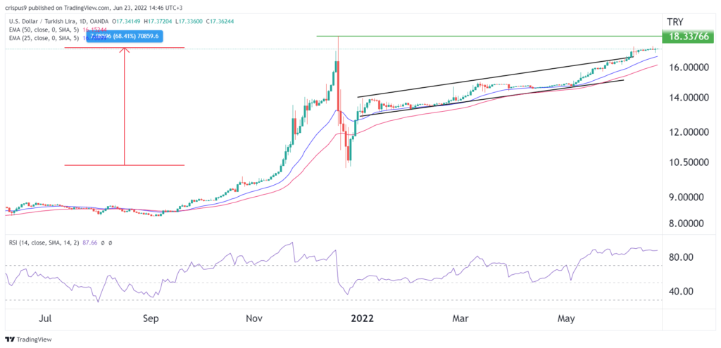 Η λίρα έκλεισε το έτος με πτώση 44% έναντι του δολαρίου το 2021, μια πτώση που βοήθησε να εκτοξευθεί ο πληθωρισμός στο 73,5% τον Μάιο, το υψηλότερο επί της διακυβέρνησης του Τούρκου προέδρου Ρετζέπ Ταγίπ Ερντογάν.